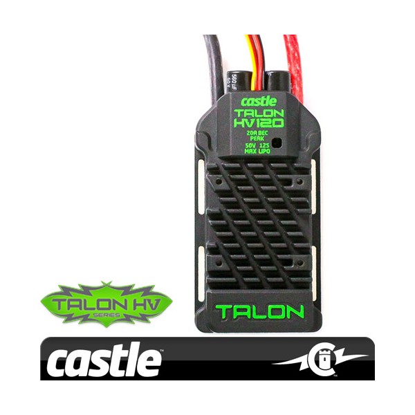 Talon HV120 has the power in all the right places, and the looks to match. The first high voltage controller to come out of the Castle factory with a built in BEC deserves nothing but the biggest BEC we could muster. No more reaching for an external BEC or messing with extra wiring. At the heart of this powerhouse sits a 20A peak ** BEC with selectable 6v or 8v output voltage. With a voltage input range from 3S to 12S LiPo, and a 120A* continuous amperage capability, it’s capable of up to 6000W of continuous power for a wide variety of heli and fixed wing applications. Its sleek aluminum case not only ensures your Talon HV stays cool during high power demand situations, but also looks the part while doing it. For those seeking optimum cooling performance, we are offering a 40mm fan accessory, it is recommended for set ups with low airflow, such as under canopies or in a fuselage. Talon HV users will have access to our industry leading software functions and USB programming capability via Castle Link USB adapter***.