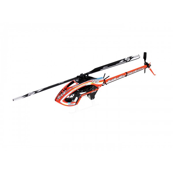 This helicopter is designed to run on a 6s pack ranging from 2200 to 2700 mAh and comes with blades. You simply need to get a motor, servos (micro cyclic & mini tail), an ESC and a flight controller! We recommend either the HobbyWing 60 or 80 amp controllers or the Scorpion 06_80. All of these are excellent choices, if you are planing on doing mild 3D or sport flying, the HobbyWing 60 is the best choice, for harder 3D, then the 80 amp ESCs are preferred.