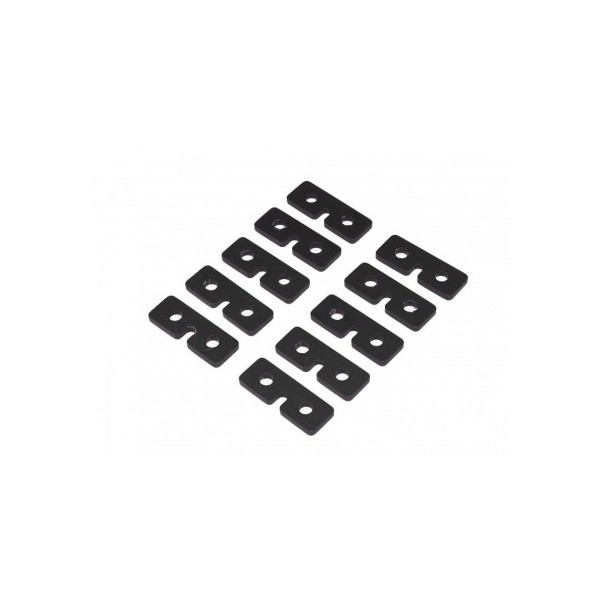These servo retaining plates are designed to fit under the screw heads and over the top of the rubber mounting grommets. By bridging the gap between the mounting rubbers and covering the full surface area it helps to reduce movement of the servo under load whilst retaining vibration absorbtion.