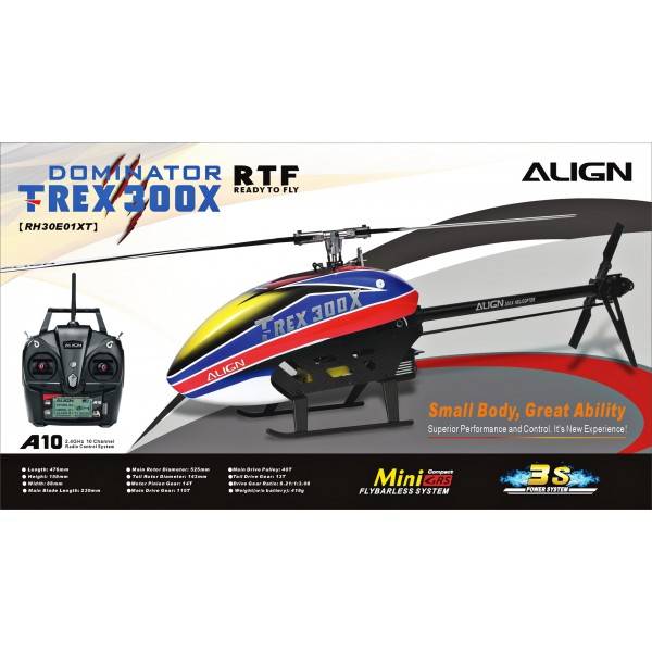 Align newly designed T-REX 300X RTF (Ready to Fly), pre-assemble and combo with ALIGN A10 transmitter 10 channels 2.4GHz system and MiniGRS gyro makes flying much easier.